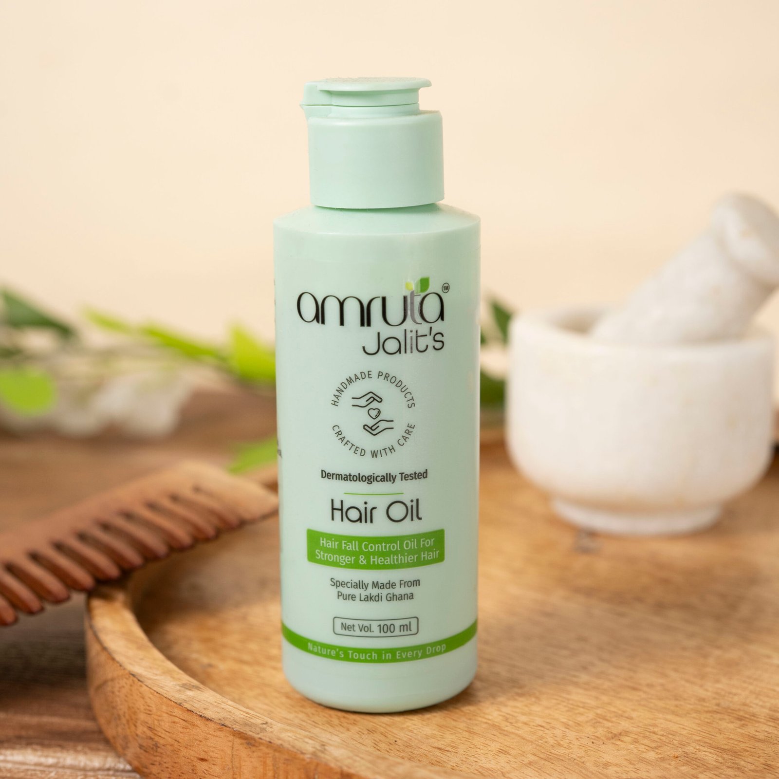 Amruta Jalit’s Hair Oil is a premium, handmade blend infused with traditional lakdi ghana (wooden churned) extracts to deeply nourish the scalp and hair. Crafted using time-honored Ayurvedic methods, this herbal oil strengthens roots, promotes hair growth, and reduces hair fall naturally. It helps restore moisture, improve scalp health, and add a natural shine to your locks without any greasy residue. Free from sulfates, parabens, and synthetic additives, Amruta Jalit’s Hair Oil is the ideal choice for those seeking a pure, chemical-free hair care solution. Perfect for regular use across all hair types.